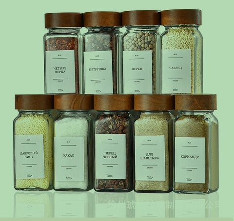 צנצנות תבלינים מרובעות זכוכית בנפח 4 oz עם ראשי שייקר עם ברגים מכסי עץ אטומים פקקים תוויות תבלינים מודפסות מראש